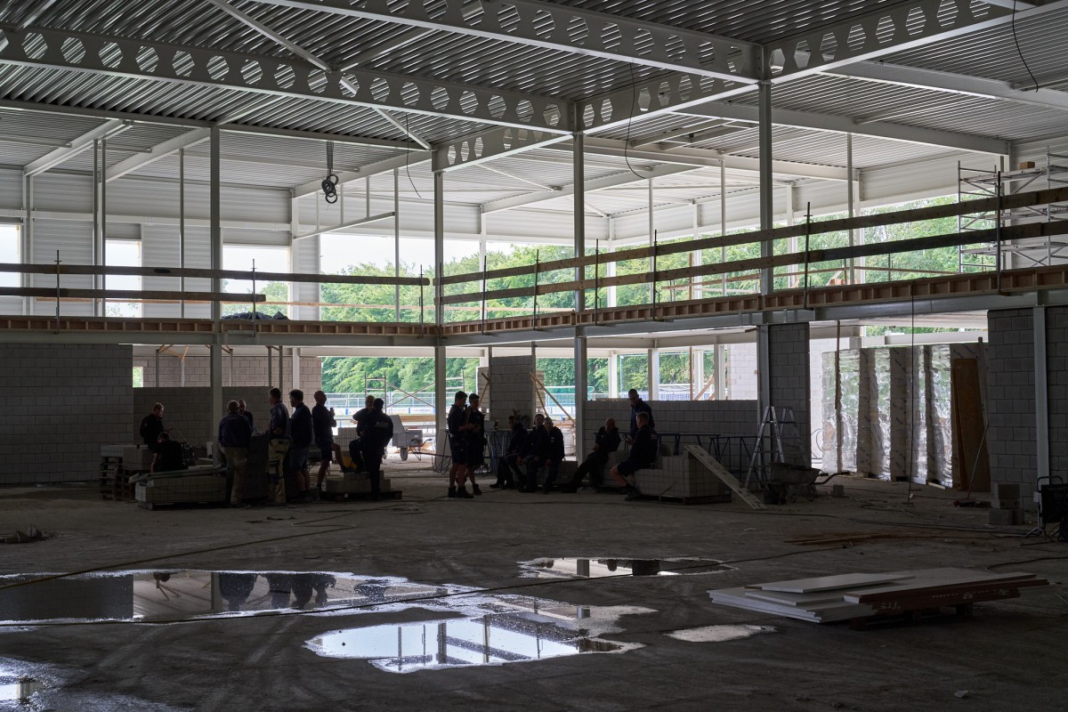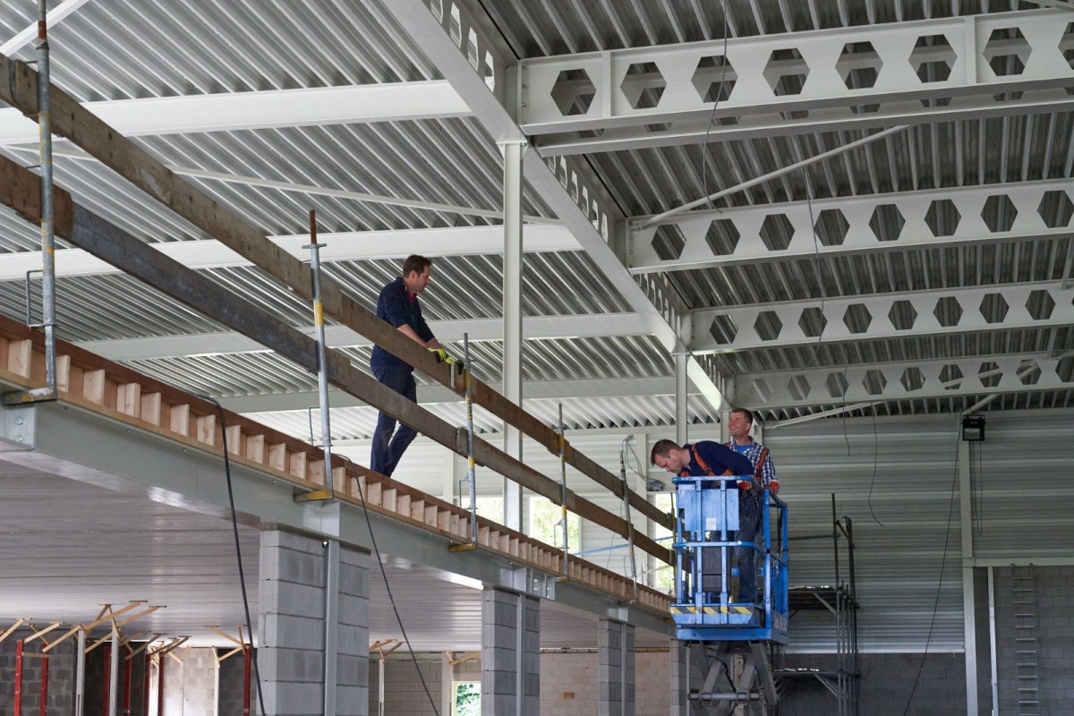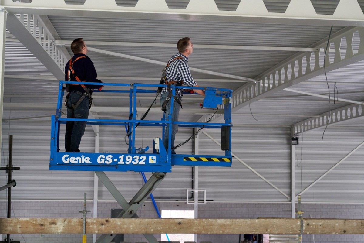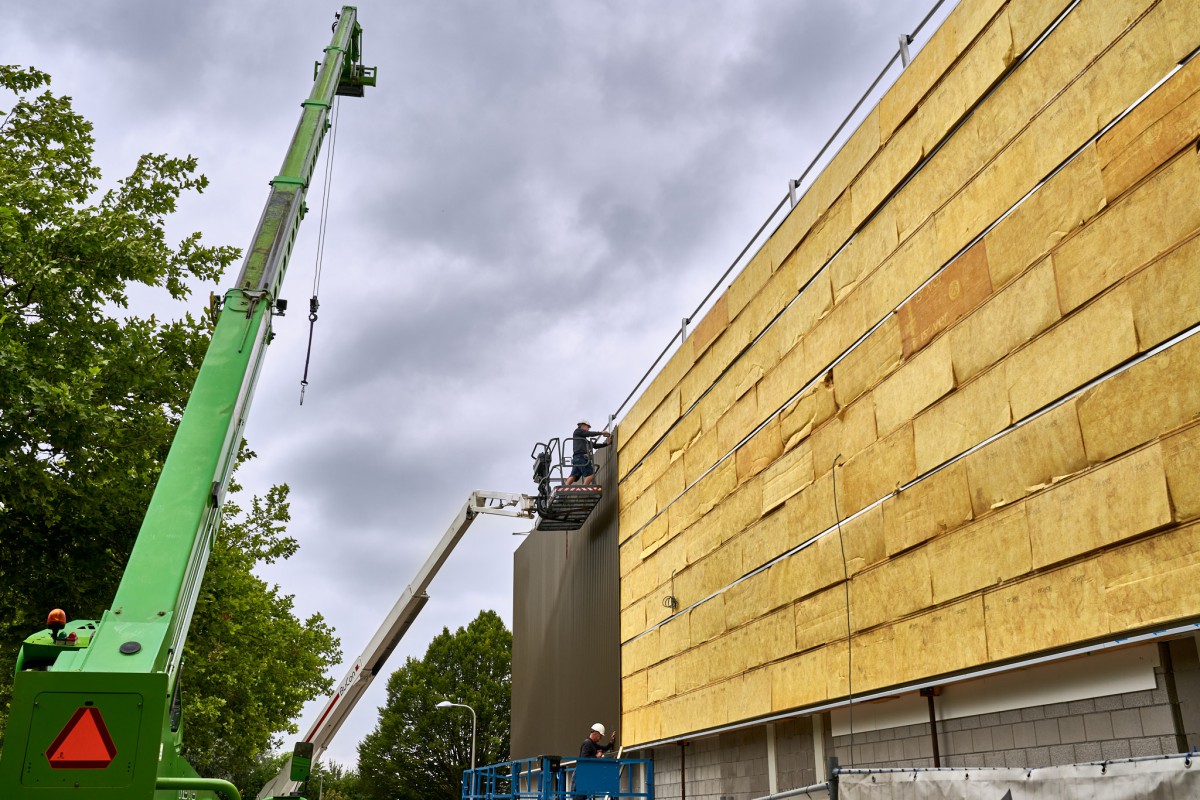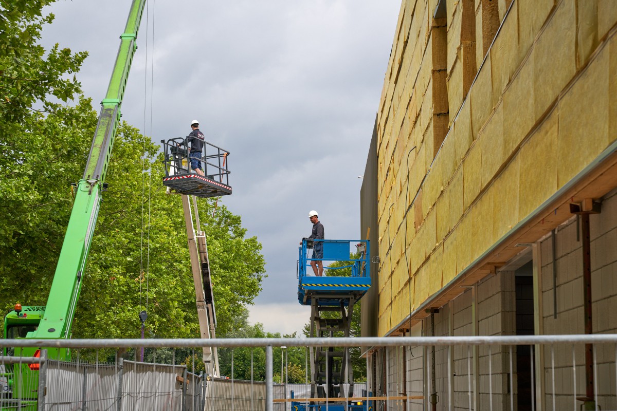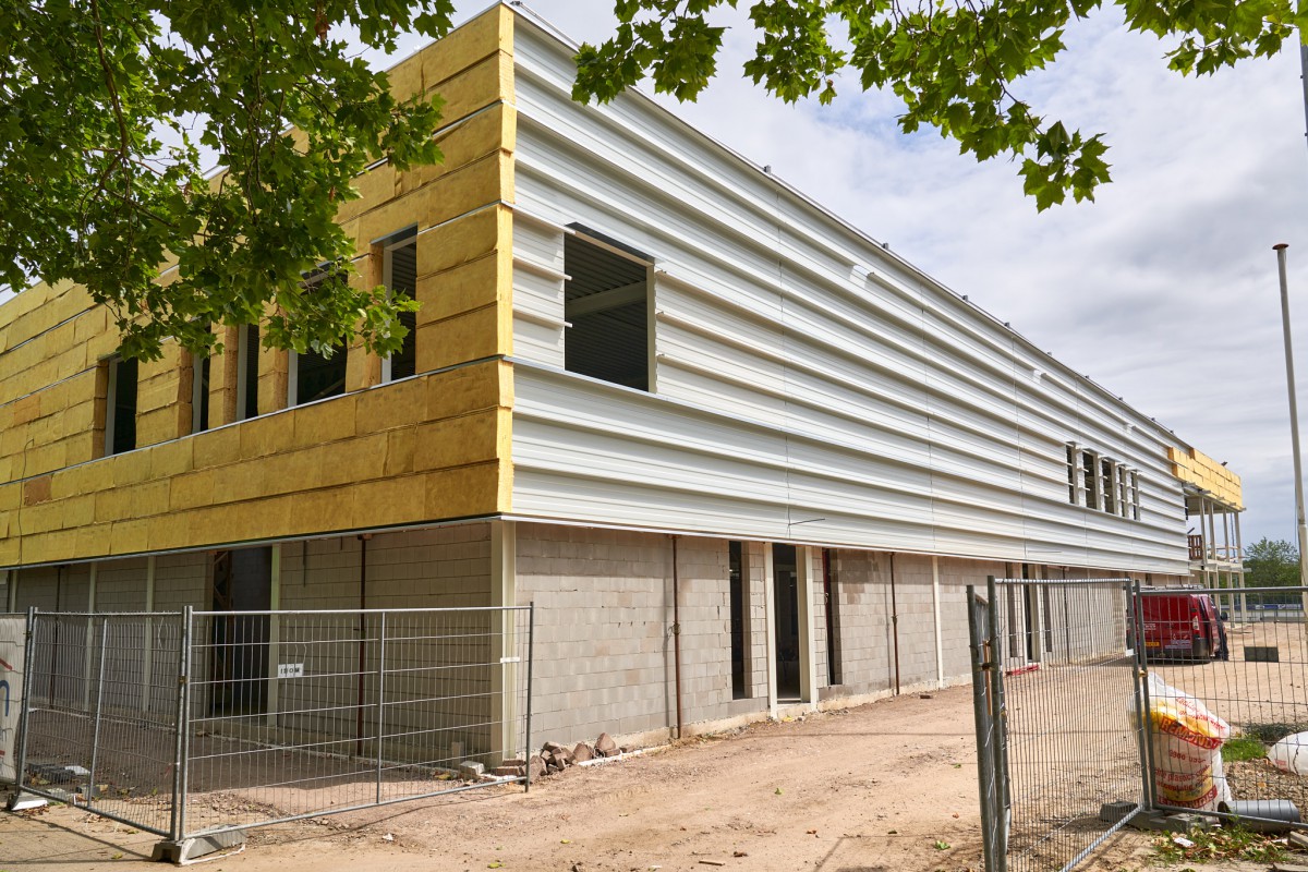 Het stalen skelet dat zich in juni oprichtte op De Mors, is inmiddels nauwelijks nog herkenbaar. Nog even en ook het gele isolatiemateriaal zal aan het oog onttrokken zijn. De aanblik wordt dan bepaald door het groene plaatstaal dat op zijn beurt gedeeltelijk bedekt zal worden met hout. Het enige wat er dan nog nodig is om de resterende gevelgaten te vullen is de levering van het glas. En met het transparante karakter dat Sporthal de Mors krijgt, zijn dat flinke oppervlaktes. Een mooie klus voor de experts.