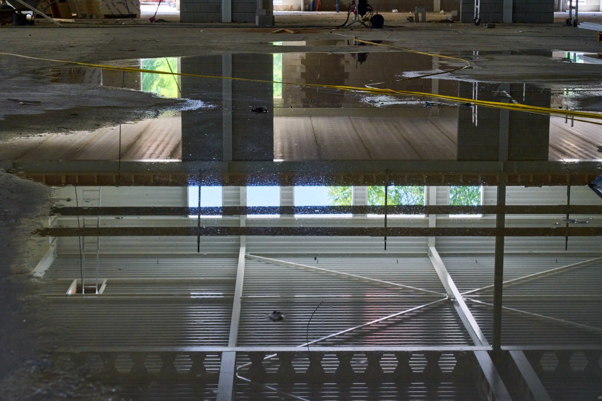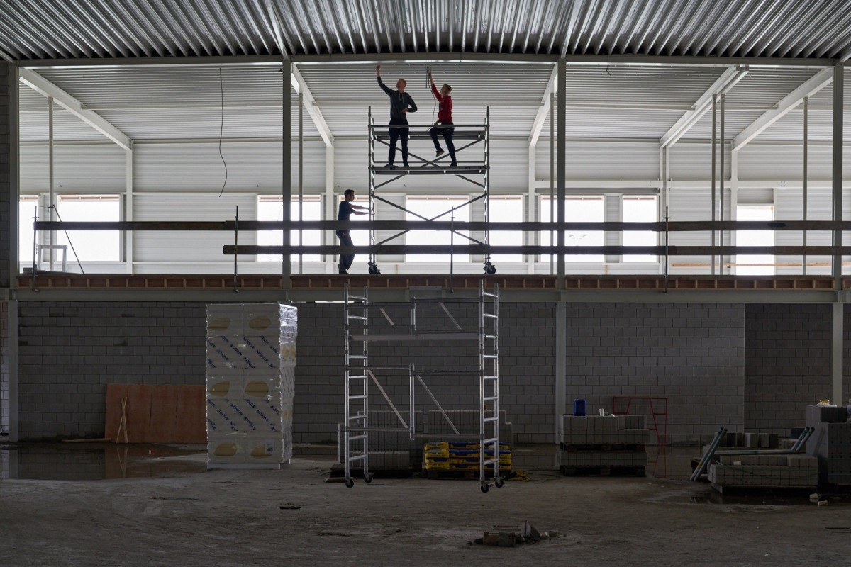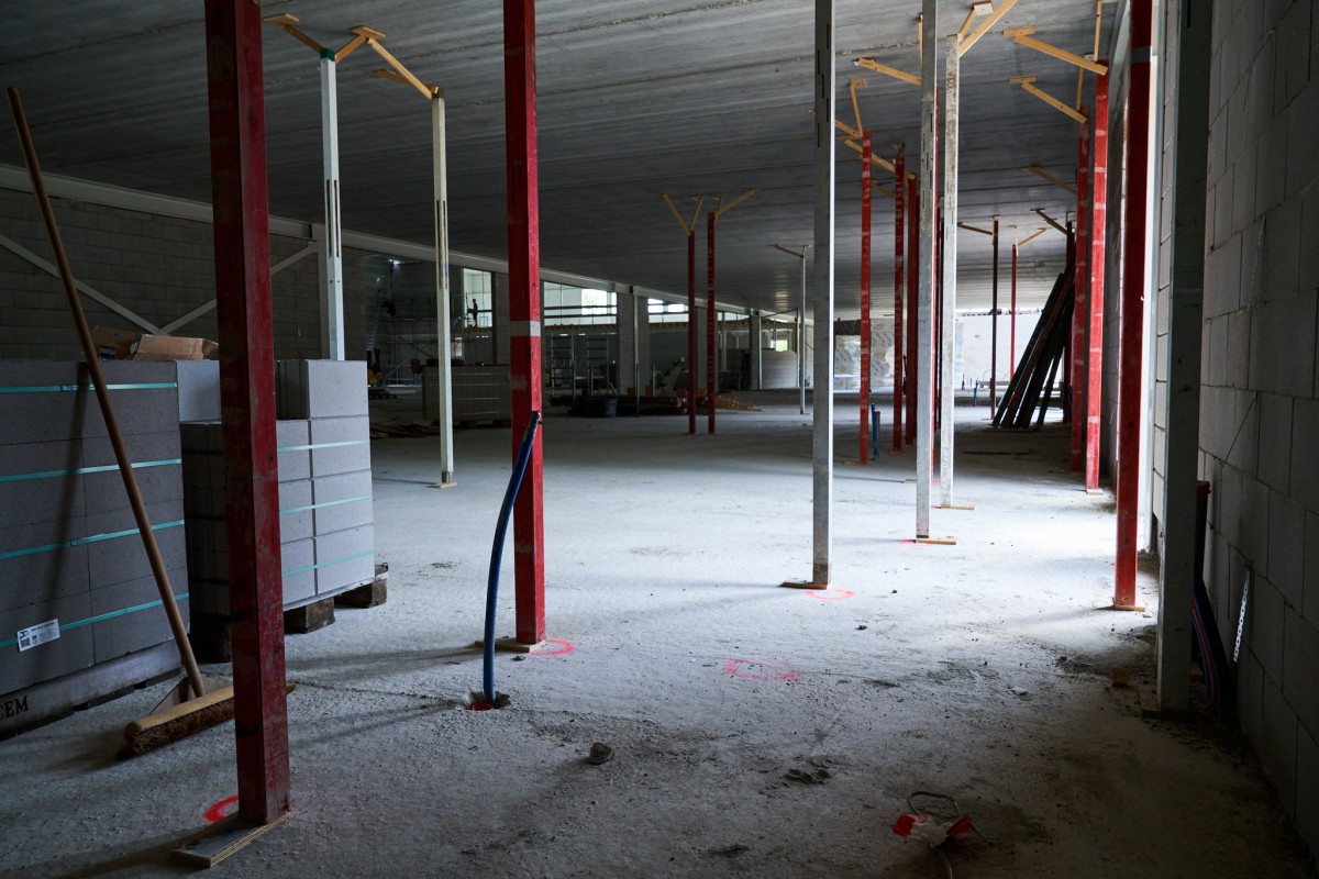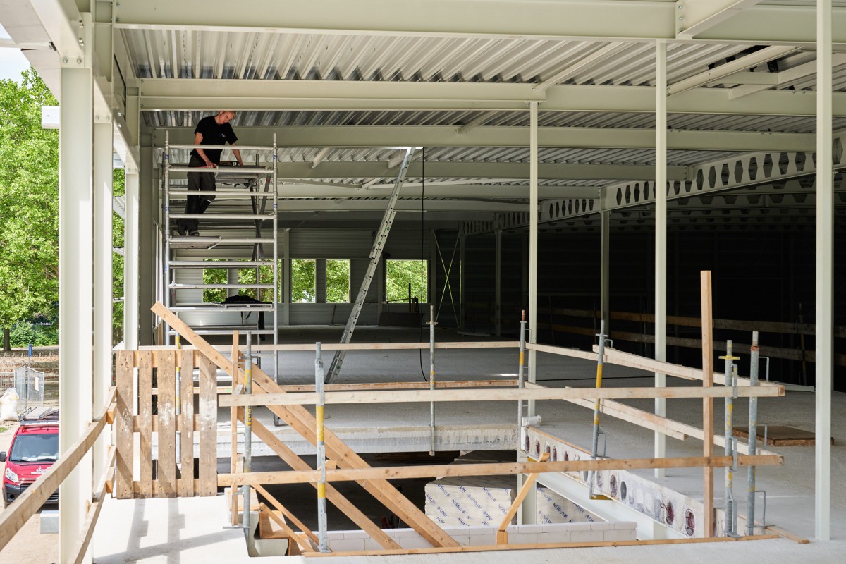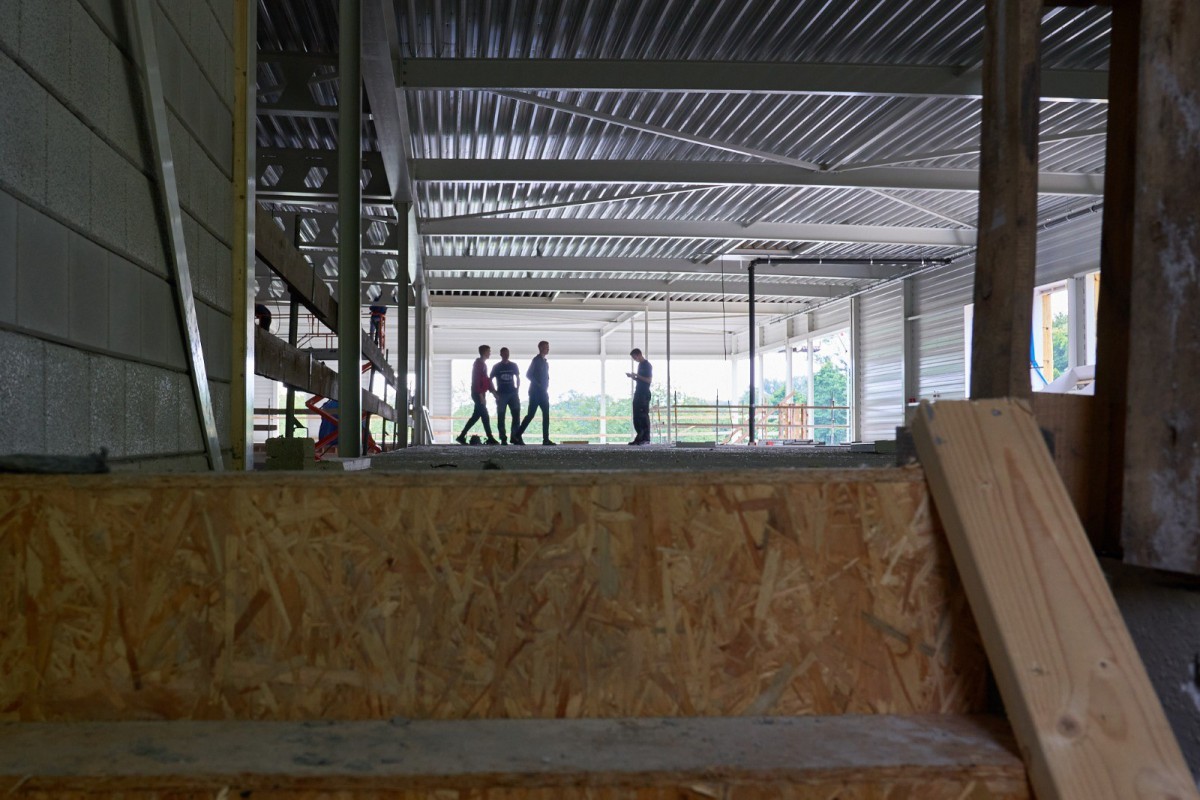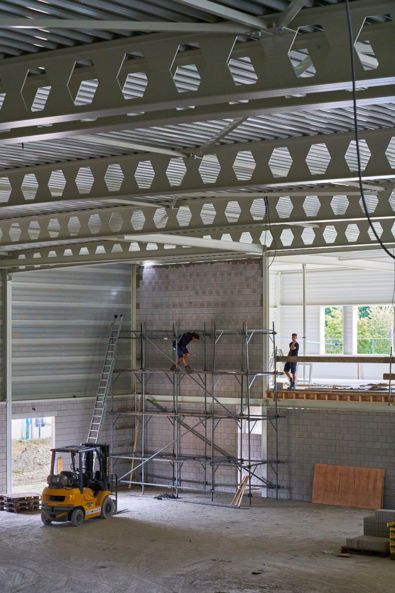 Het stalen skelet dat zich in juni oprichtte op De Mors, is inmiddels nauwelijks nog herkenbaar. Nog even en ook het gele isolatiemateriaal zal aan het oog onttrokken zijn. De aanblik wordt dan bepaald door het groene plaatstaal dat op zijn beurt gedeeltelijk bedekt zal worden met hout. Het enige wat er dan nog nodig is om de resterende gevelgaten te vullen is de levering van het glas. En met het transparante karakter dat Sporthal de Mors krijgt, zijn dat flinke oppervlaktes. Een mooie klus voor de experts.