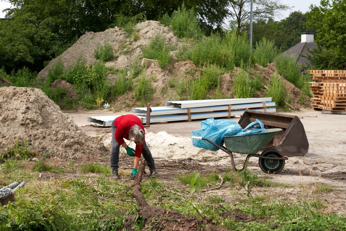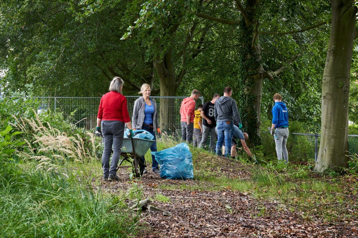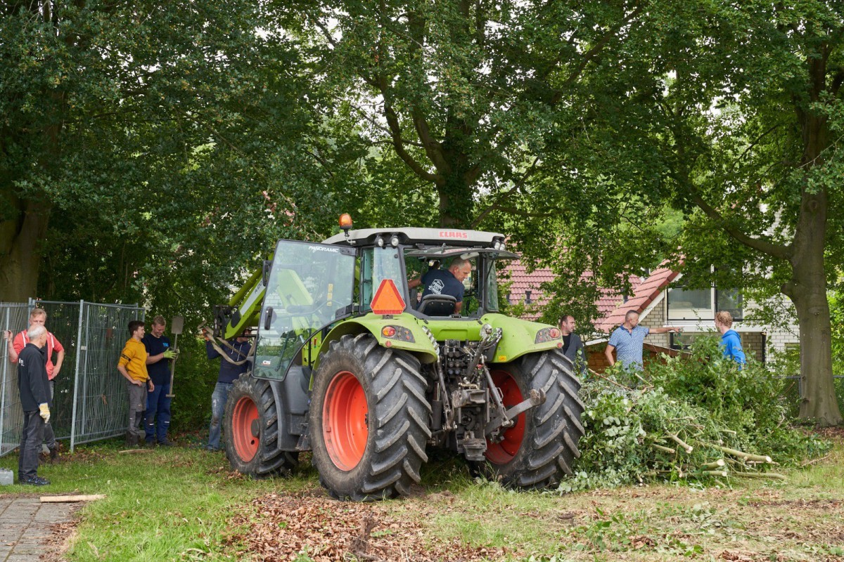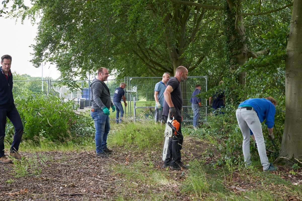 Ruim veertig vrijwilligers maakten zich afgelopen zaterdag boos op hekken, struiken en dopjes. Vooral de dames en heren die zich over die doppen ontfermden leverden monnikenwerk. Duizenden bouten moesten bedekt worden om te voorkomen dat de ballen straks op hoogte zouden blijven steken. Een klusje voor lieden zónder hoogtevrees en mét doorzettingsvermogen. Toch was ook de hulp van hen die de woekerende heesters en misplaatste hekken te lijf gingen net zo welkom. Zowel het grondwerk, als ook de hoogteklus wordt eind augustus vervolgd.